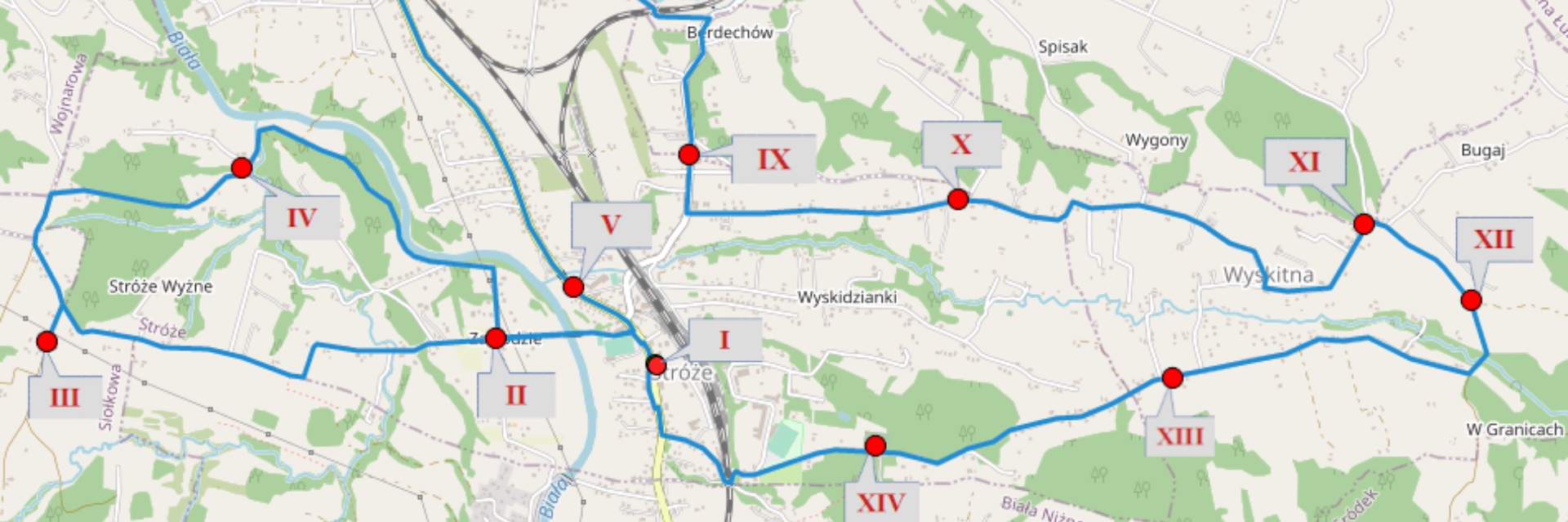 Serdecznie zapraszamy do przeżywania Męki Pańskiej w formie drogi krzyżowej w plenerze. Proponowana droga krzyżowa wokół Stróż ma na celu połączenie modlitwy z wysiłkiem na świeżym powietrzu wśród pól i domów naszej Parafii. Stacje drogi krzyżowej to przydrożne krzyże, kapliczki czy charakterystyczne miejsca terenu. Drogę krzyżową można przejść w dowolnym dniu, o dowolnej porze dnia czy nocy, indywidualnie lub w gronie rodziny i przyjaciół. Droga krzyżowa zaczyna się i kończy przy krzyżu misyjnym. Pierwsza część to Zawodzie i Zagórze, druga część to Stróże Niżne i Berdechów, trzecia część drogi krzyżowej to Wyskidzianki i Wyskitna - trzy wzgórza wokół Stróż. Całość trasy /21 km/ dla większości może być zbyt dużym wysiłkiem, dlatego proponujemy drogę krzyżową wokół Stróż podzielić na trzy części i przebyć ją spokojnie w trzy różne dni. Dla wizualizacji trasy drogi krzyżowej i poszczególnych stacji przedstawiamy mapy.